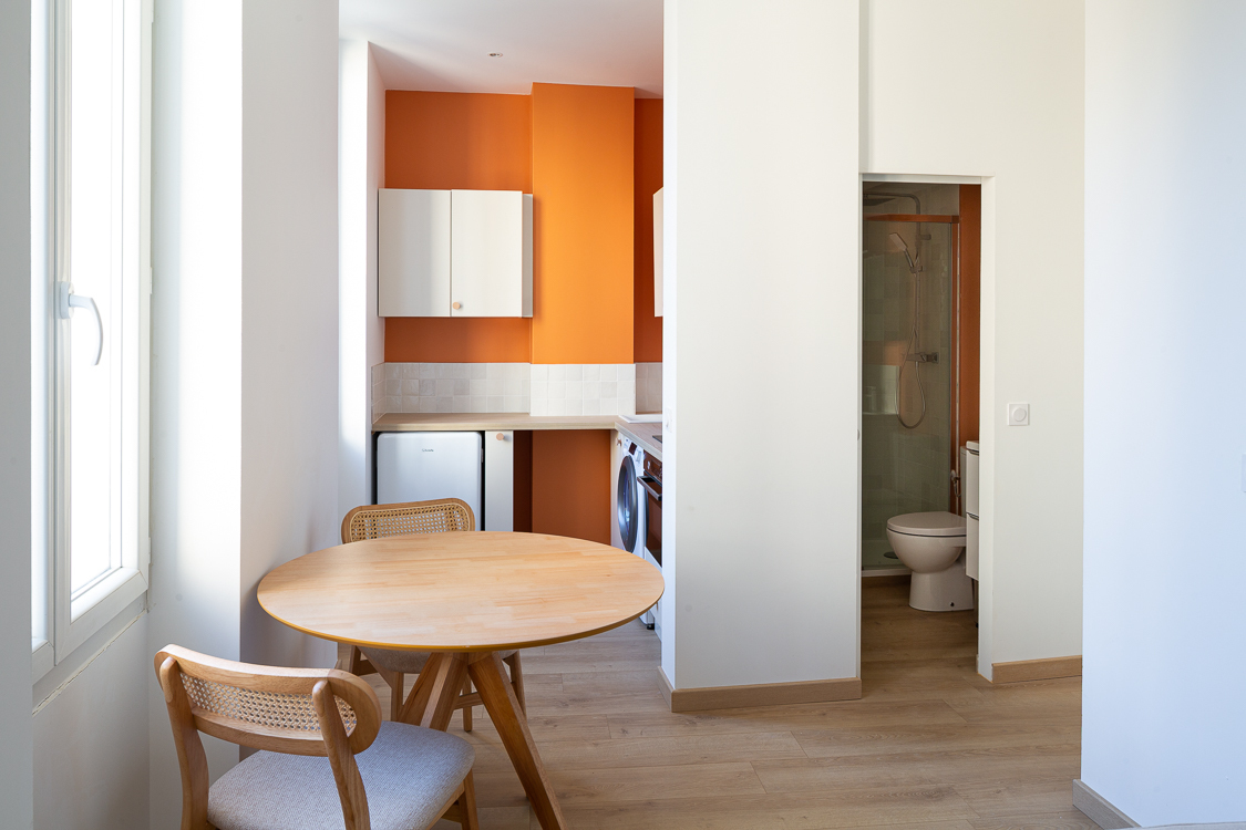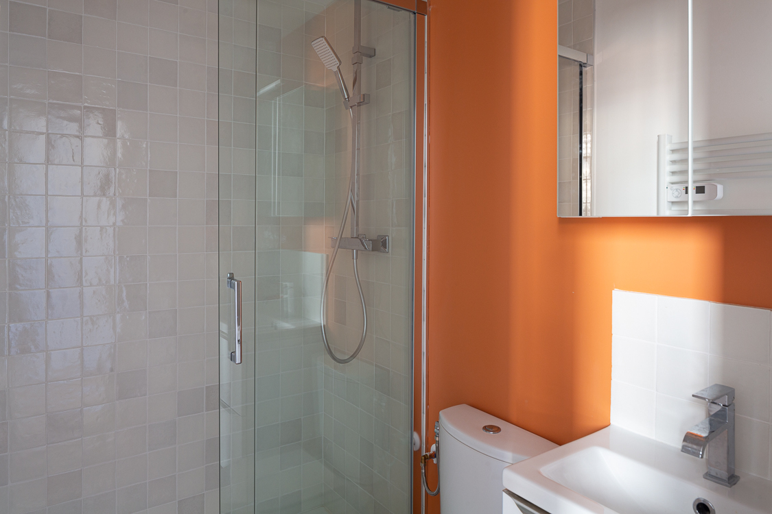 Le studio est orienté est, sur jardin, aucune nuisance sonore ni vis à vis. Il est composé d'une entrée, d'une salle d'eau avec porte coulissante, meuble évier, WC, sèche serviette et grande douche 80*120cm.
