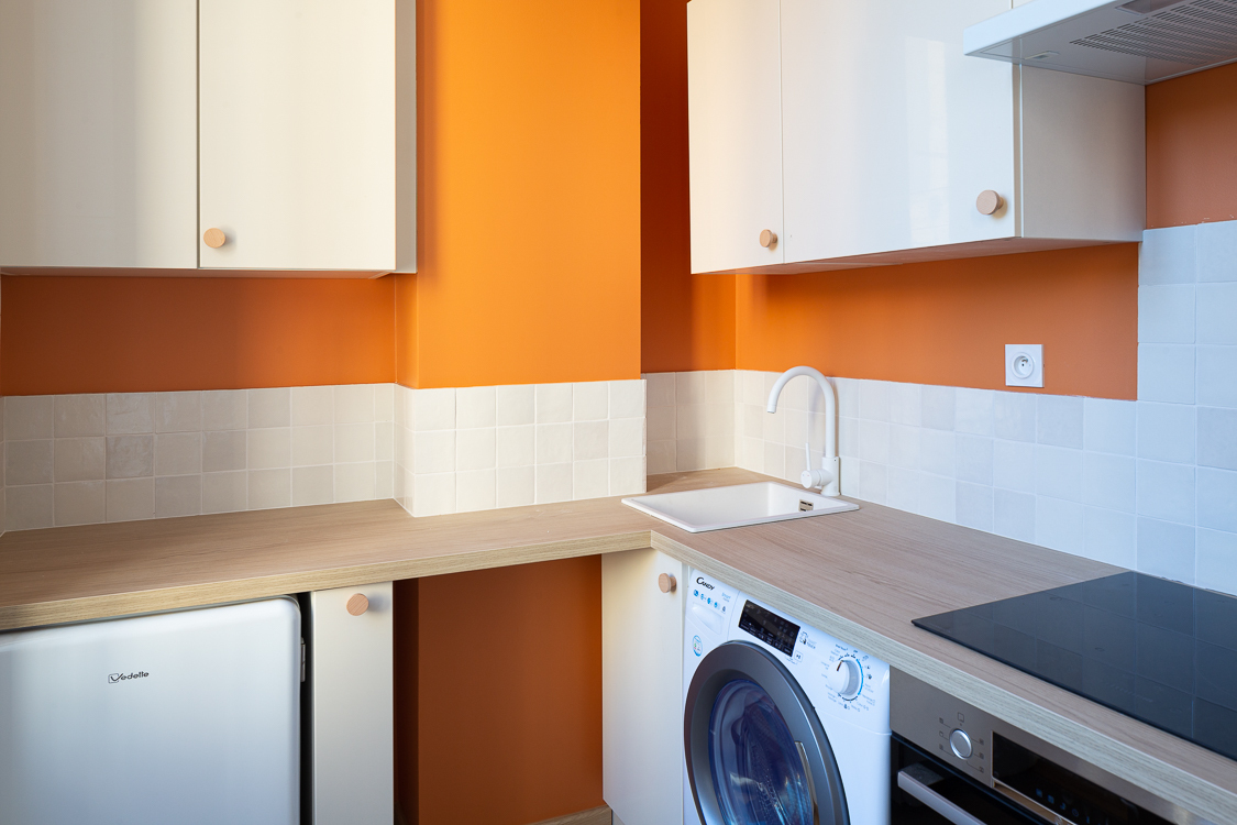 Cuisine équipée avec réfrigérateur top VEDETTE, plaque induction 4 feux THOMSON, hotte, four combi/micro ondes BOSH,, lave linge séchant CANDY.