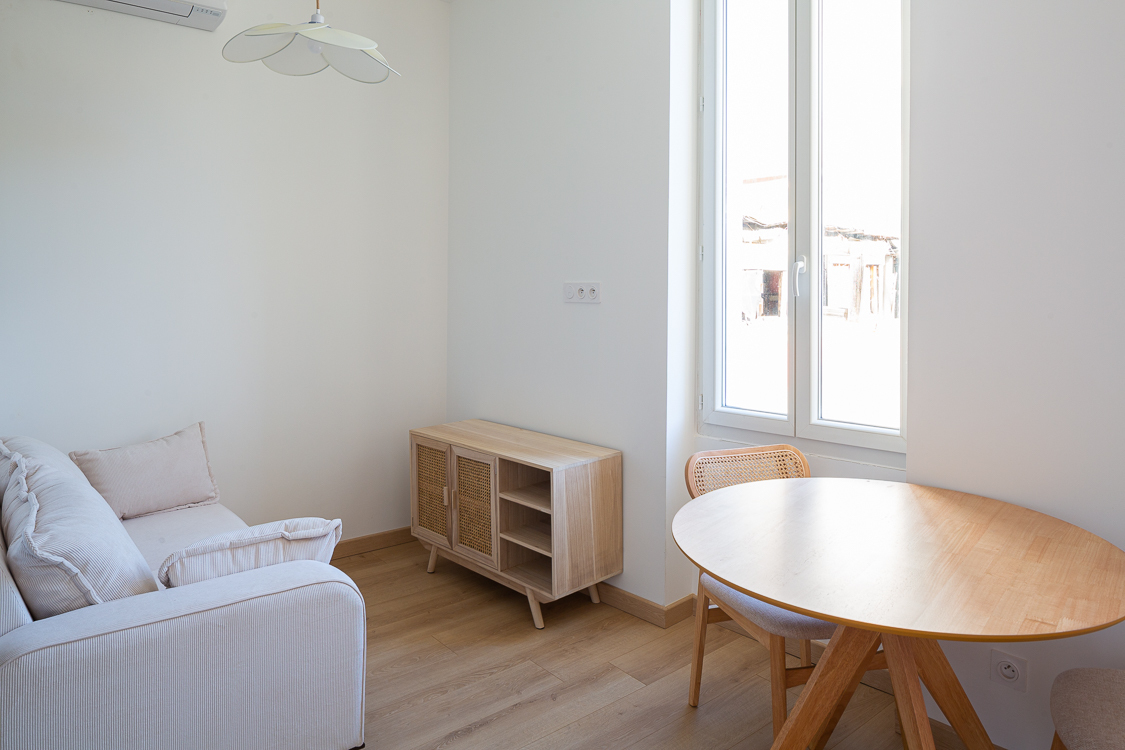 Pièce à vivre ouverte avec 2 doubles fenêtres, canapé, meuble TV, table et 2 chaises, climatisation réversible.