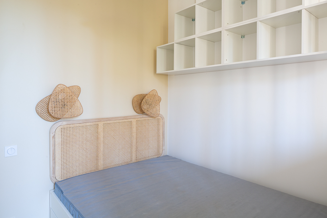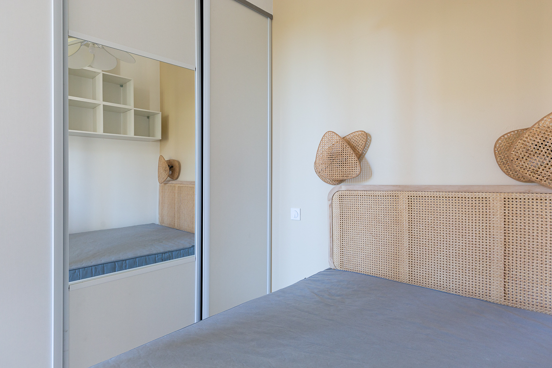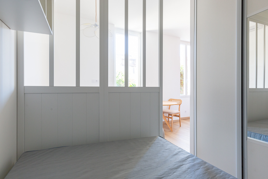 La chambre est séparée par une verrière et contient un lit 140cm avec 2 tiroirs, des rangements muraux et une penderie aménagée avec 3 portes coulissantes.